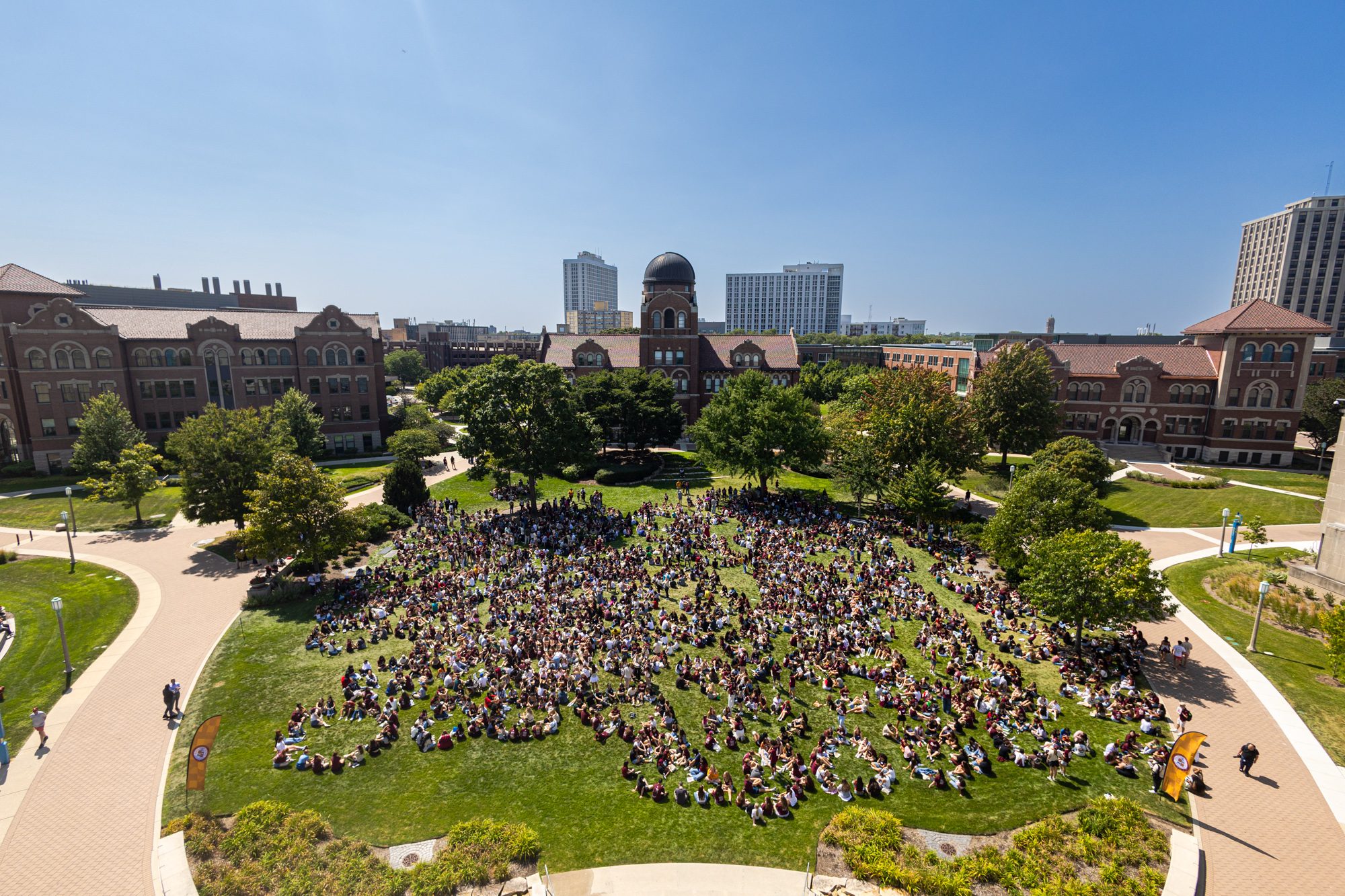 The incoming Class of '28 participates in Welcome Week traditions, like walking through the Cudahy Library doors, Water Tower Campus Block Party, movies on the quad, and Pack the Park.