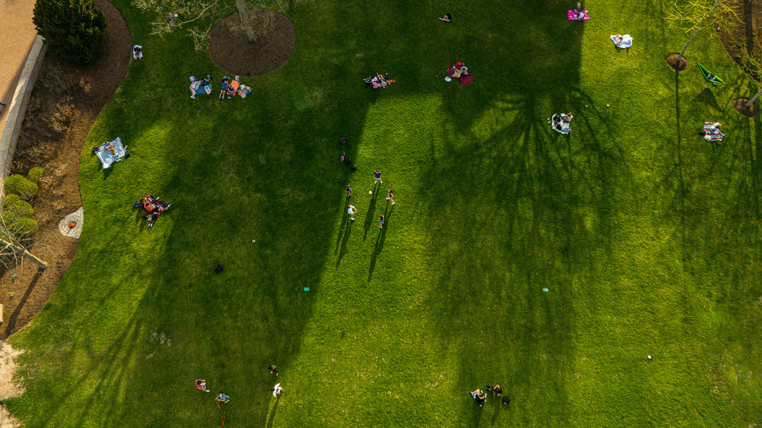 Students relax and play games on the East Quad during a stretch of warm spring weather.