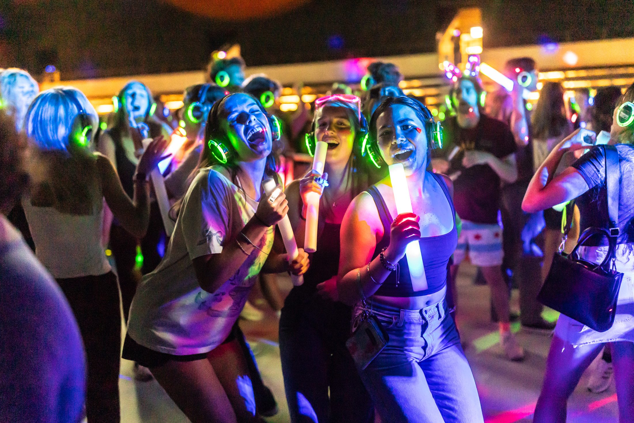 Glow sticks and disco lights lit up Gentile Arena during the Silent Disco, where students wear headphones and pick between a selection of songs to get their groove on.