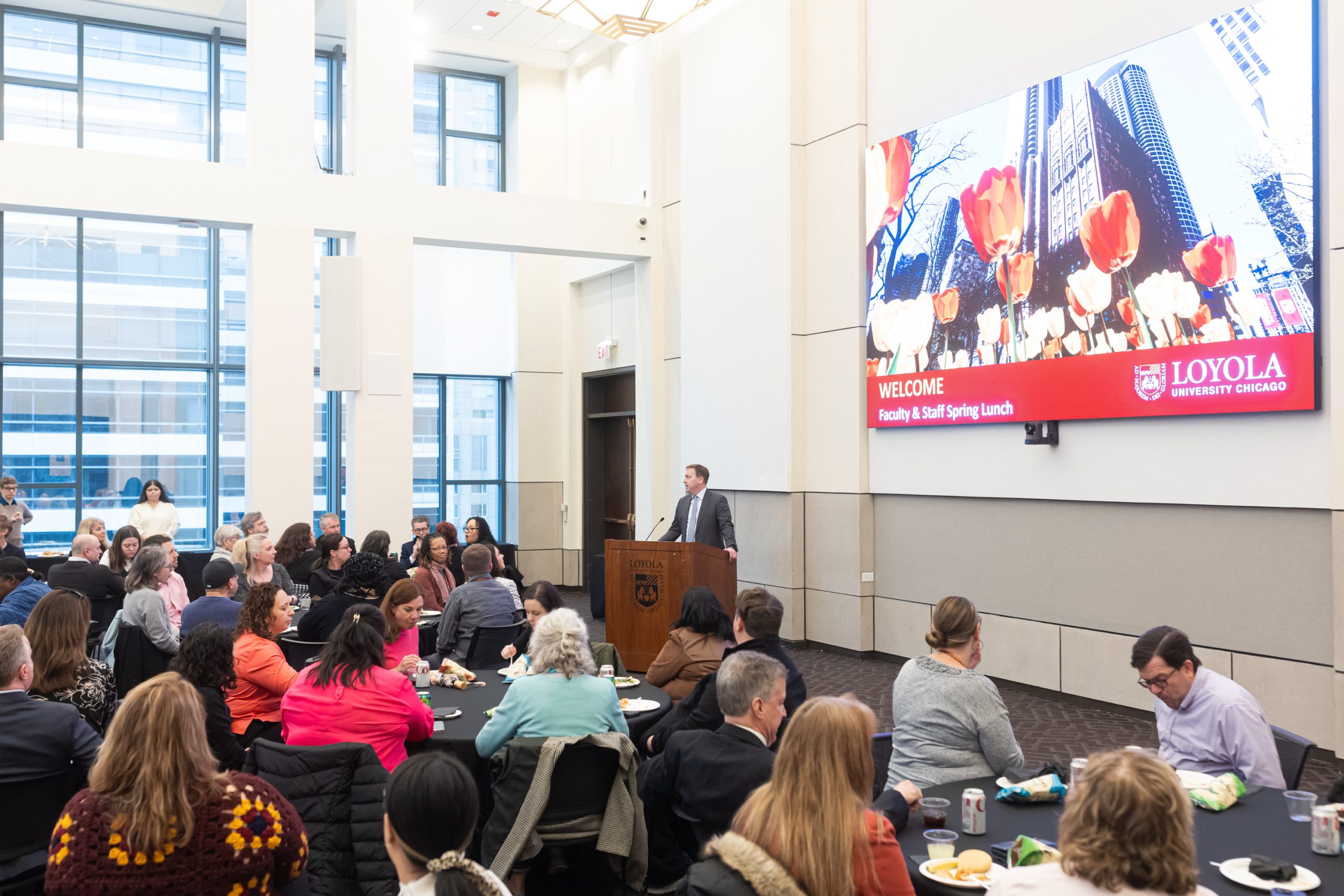 President Mark C. Reed speaks at the Water Tower Campus Faculty and Staff Spring Luncheon in Corboy Law School.